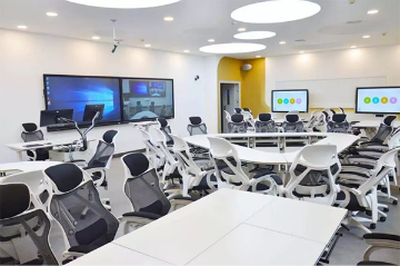 步入這5間“精品智慧教室”,恍如進入了一個異構空間,不管是黑白配色的高冷,還是黃灰搭配的溫暖,抑或亮綠的時尚,都給人一種現代、時尚、大氣和充滿科技感的視覺沖擊。