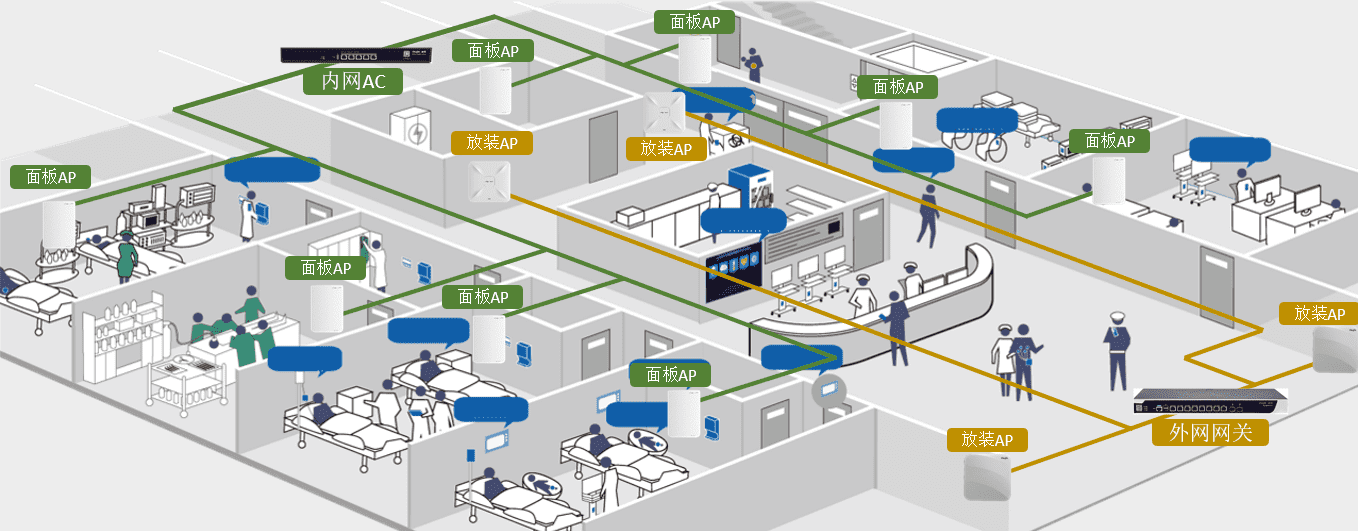 快速部署需求方艙醫(yī)院建設(shè)以速度快為主要特點,應(yīng)保證供應(yīng)快、實施快,不能讓網(wǎng)絡(luò)實施拖了整體建設(shè)的后腿。無線接入質(zhì)量需求Internet出口應(yīng)滿足方艙醫(yī)院的醫(yī)患容量;如何保障在有限帶寬下,讓每個人都擁有公平網(wǎng)絡(luò)流量?如何應(yīng)對一些視頻類,大流量用戶問題?醫(yī)護(hù)人員和患者使用的手機(jī)品牌及價格不同,導(dǎo)致了具備的接入能力不同,如何為高中低端手機(jī)提供穩(wěn)定的WiFi接入更為關(guān)鍵;最后,要保障醫(yī)護(hù)人員和患者在移動過程使用WiFi的良好上網(wǎng)體驗?;A(chǔ)設(shè)施齊全需求方艙醫(yī)院網(wǎng)絡(luò)基礎(chǔ)系統(tǒng)設(shè)施應(yīng)該齊備,保證內(nèi)網(wǎng)業(yè)務(wù)正常運轉(zhuǎn)及患者基本所需,不應(yīng)出現(xiàn)缺失設(shè)備情況,投入使用后難以補(bǔ)救,造成損失。安全隔離管理需求投入使用之后的方艙醫(yī)院,尤其是污染區(qū)的隔離病房,屬于高危區(qū)域,一旦設(shè)備出現(xiàn)故障,運維人員一般很難到達(dá)現(xiàn)場進(jìn)行維護(hù),因此,網(wǎng)絡(luò)設(shè)備應(yīng)支持授權(quán)遠(yuǎn)程運維的功能,保障運維人員對內(nèi)網(wǎng)設(shè)備進(jìn)行遠(yuǎn)程維護(hù)、升級。監(jiān)控承載需求監(jiān)控承載方艙內(nèi)外的安全任務(wù),方艙醫(yī)院內(nèi)有大量監(jiān)控點位,對網(wǎng)絡(luò)的大流量承載能力提出需求。同時,監(jiān)控點位的部署還要考慮醫(yī)患的隱私。