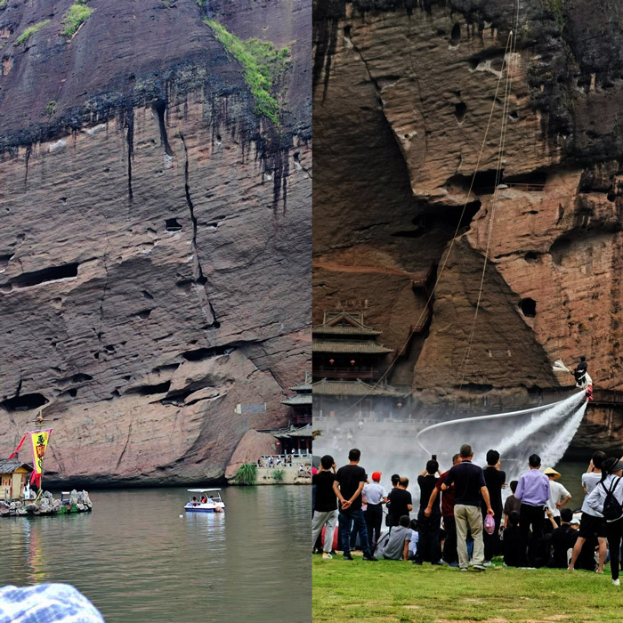 竹筏到了仙水巖景區(qū)前一段比較開闊的河面,我們也下了竹筏,觀看場景演出??罩酗w人的水上表演,上下翻滾,騰云駕霧,蛟龍出水,哄托了現(xiàn)場的整個氣氛。鸕鶿捕魚、采仙草、仿古升棺等表演,讓你在復(fù)原的場景中真正體會到傳統(tǒng)的勞作、勇敢的山民和未解的千年之謎的無窮奧妙。